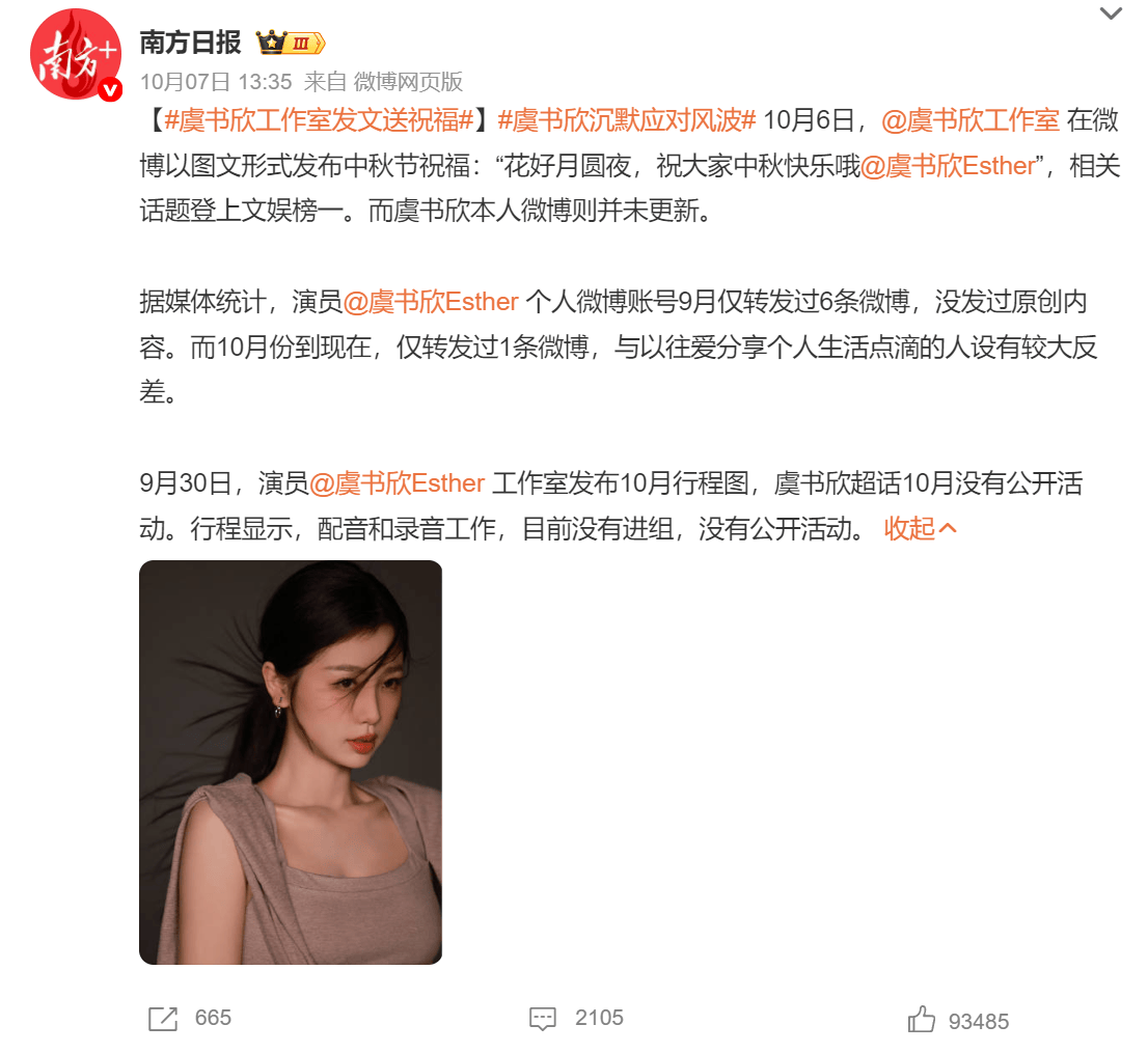 “南方日报”则指出虞书欣10月份至今仅转发一条微博,与以往爱分享个人生活点滴的人设有较大反差。而受舆论风波影响,虞书欣10月没有公开活动,行程显示,配音和录音工作,目前没有进组,没有公开活动。