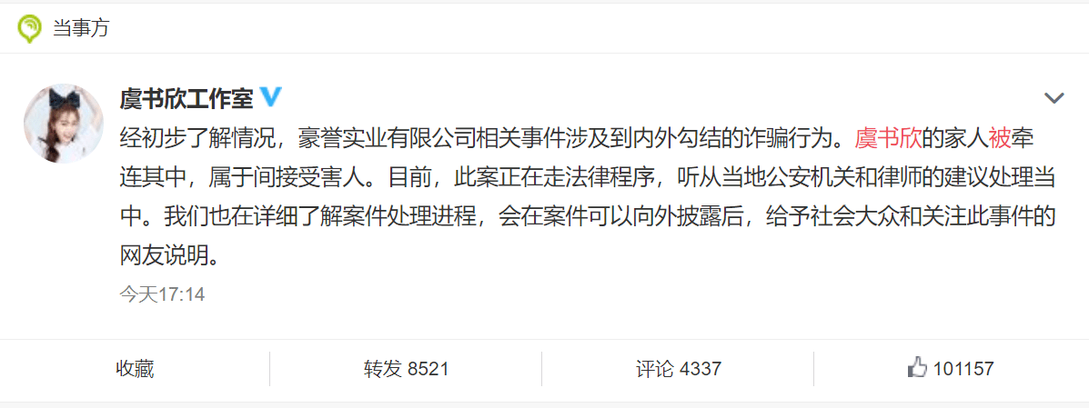 现在看来,如果虞书欣方面始终沉默,或许结果还能好一点,但虞书欣工作室甩锅豪誉实业,称该公司涉及内外勾结的诈骗行为,虞书欣的家人被牵连其中,属于间接受害人。
