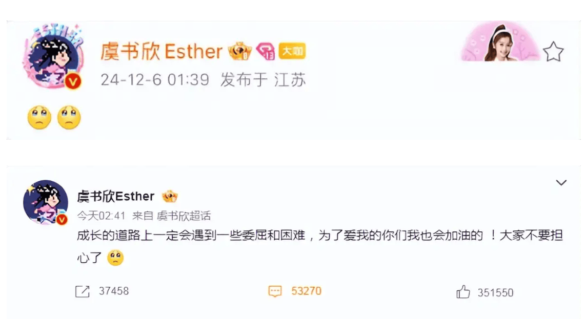 或许是人红是非多吧,到了2024年12月,虞书欣两次发声引发轩然大波。她在凌晨两点发文“成长的道路上一定会遇到一些委屈和困难,为了爱我的你们我也会加油的!大家不要担心了。”
