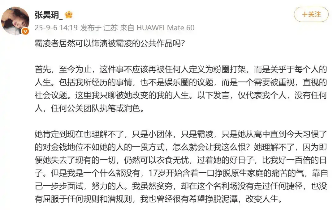 到了2025年8月,张昊玥评论区被虞书欣粉丝攻占,要求她澄清“蜘蛛精”只是玩笑,这成了张昊玥正式指控虞书欣的导火索,她用7000字的长文详述自己抑郁躯体化症状,并说“我的人生被她改写”。