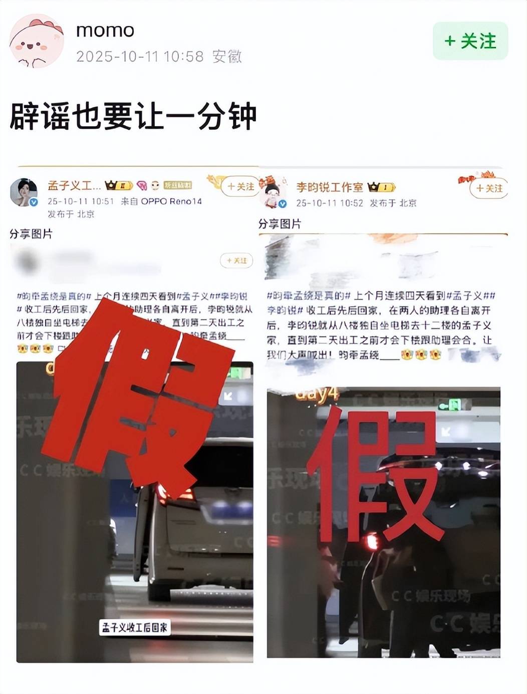 孟子义和李昀锐的双方工作室于同日上午10:51(孟子义方)和10:52(李昀锐方)发布声明,间隔仅1分钟。声明均采用同款模板:引用狗仔爆料截图,加盖醒目大红“假”字公章,未附加文字解释。