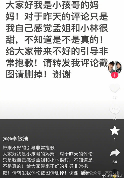这个消息瞬间炸了,没多久,小孩哥的账号赶紧发文否认:“只是我自己感觉孟姐和小林很甜,不知道是不是真的,给大家带来不好的引导非常抱歉。”