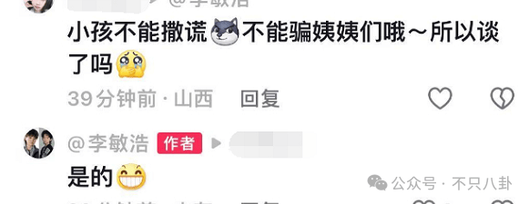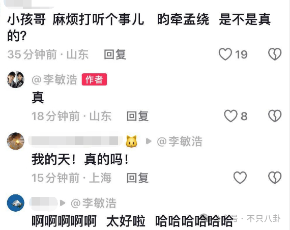 今年1月,《九重紫》中被“窦昭”(孟子义饰)收留的“小男孩”扮演者李敏浩,被网友问“昀牵孟绕是不是真的”,其回复“真”。(小孩哥账号由其妈妈运营)