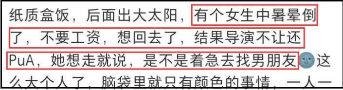 还有网友爆料导演对群演的态度很差,有女生中暑后不要工钱只想离开,都调侃女生是要急着找男朋友。