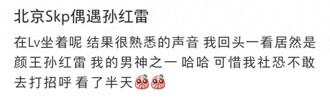 网友描述说,当时自己正坐在LV店内,忽然听到一个熟悉的声音回头一看,竟然是孙红雷。但由于社交焦虑,网友没有上前打招呼,只留下了现场照片作为记录。照片里,孙红雷穿着黑色宽松长袖卫衣,搭配白色阔腿裤,脚踩同色系鞋子,手里还提着一件外套,整个人看起来松弛却不失贵气,背影更像是40来岁的人,显得比实际年龄要年轻一些。