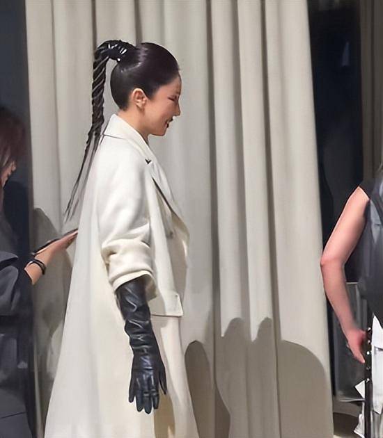 白色大衣搭配黑色长裙,手上还带俩皮手套,猛地一看好像是菜市场杀鱼的大妈,这哪有美感可言。