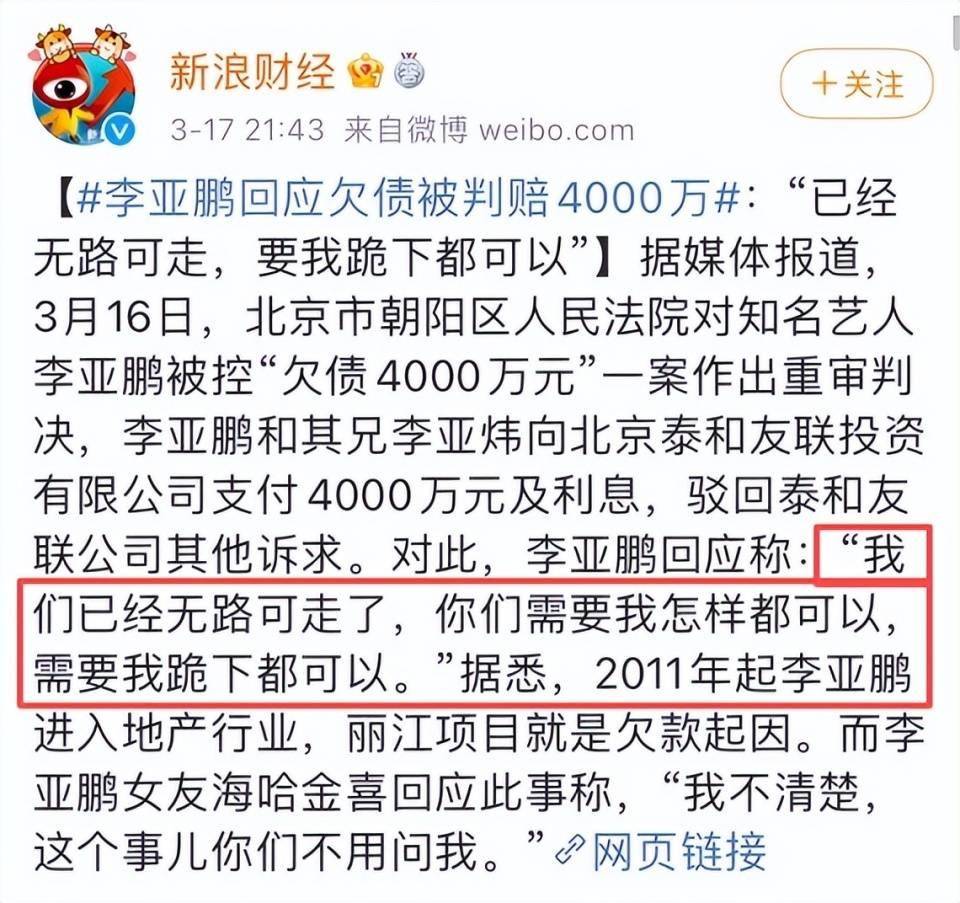 其实俩人官宣生子的下半年,李亚鹏就已经被判欠债4000万败诉。