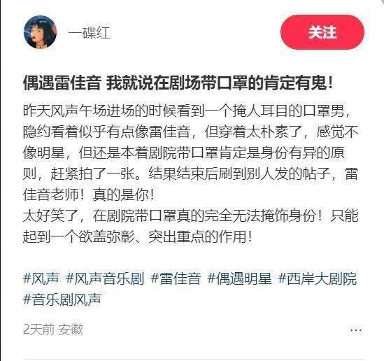 博主本着好奇的心态拍了张照片,直到散场后刷到其他网友的帖子才确认:“真的是雷佳音老师!” 她忍不住调侃:“合着口罩没起到遮脸作用,反倒成了‘身份提示器’,欲盖弥彰得太好笑了。”