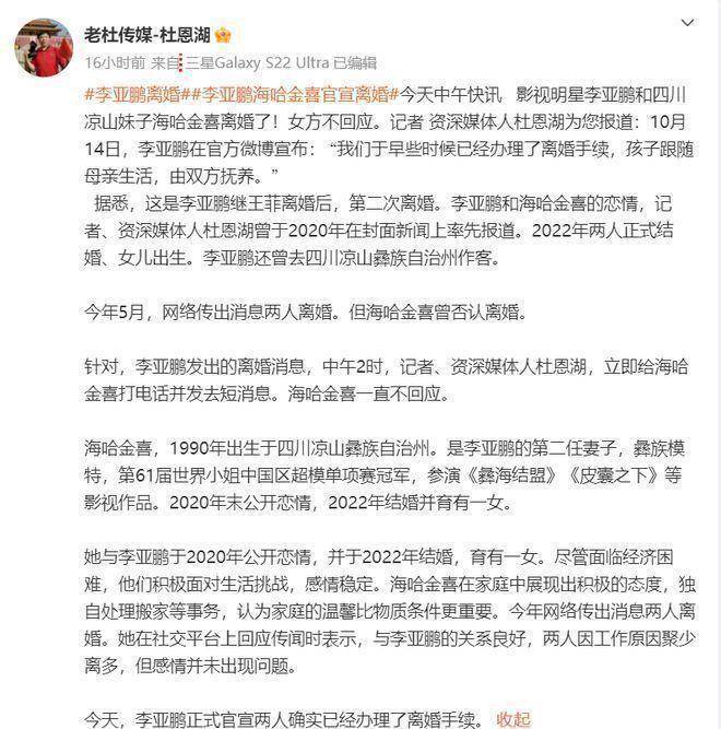 10月14日下午,李亚鹏和海哈金喜的一条共创视频刷爆全网:“我们于早些时候已办理离婚手续,孩子跟随母亲生活,由双方共同抚养。”