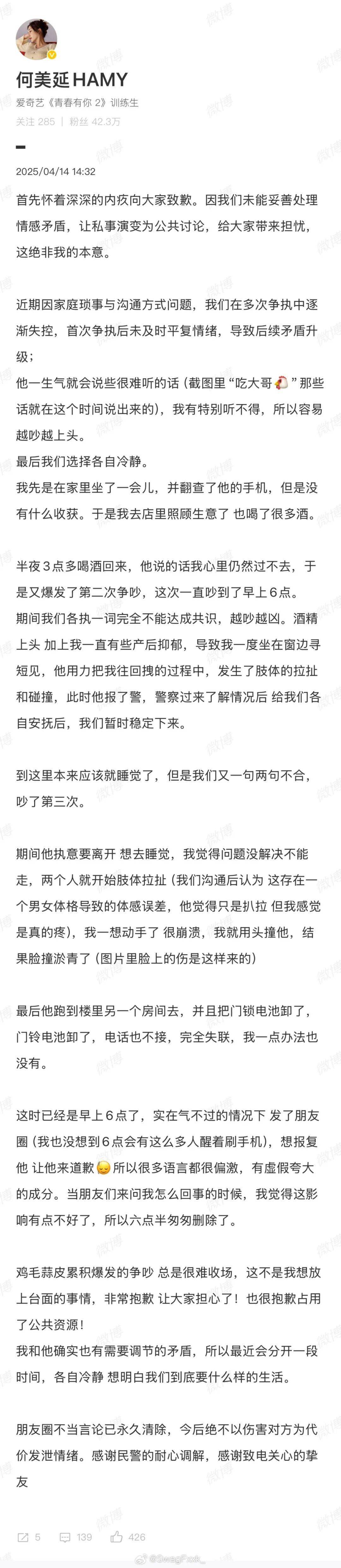 就在今天4月份,两人还因家暴一事登上热搜,当时何美延晒出被打伤的照片,开怼梁老师家暴,还在孕期聊骚!