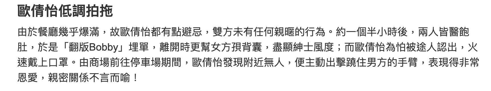 在用餐结束之后,欧倩怡与该名男士离开餐厅,其中由男士买单,离开的时候男方还为欧倩怡背包,表现得相当绅士。如果仅仅是开车接送,或是在餐厅用餐,这还是不能说明两人之间的关系,而在饭后两人从餐厅漫步到停车场期间,表现是越发地亲密。欧倩怡担心被路人认出,戴上了口罩,不过走到人少的地方的时候,她便主动地挽着男方的手臂,关系亲密,犹如情侣一般。欧倩怡挽着的这名男士,看起来已是中年人,他身材高大,打扮休闲,戴上了眼镜,还留了胡子,不过已经有了轻微的谢顶。