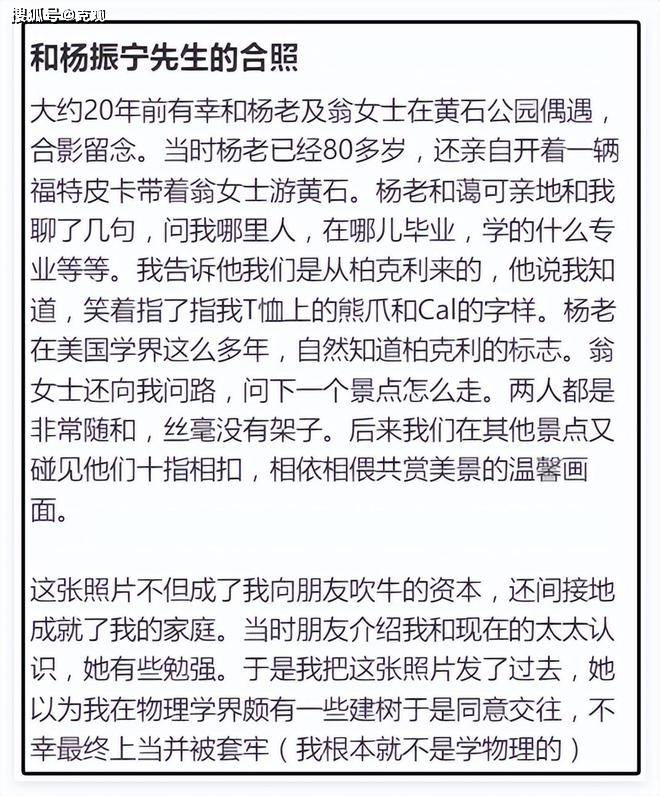 有意思的是,该网友还凭借这张照片成功找到伴侣。看到和杨振宁的合影,当时的女友以为他在物理方面颇有建树,可事实上网友不是学物理的。