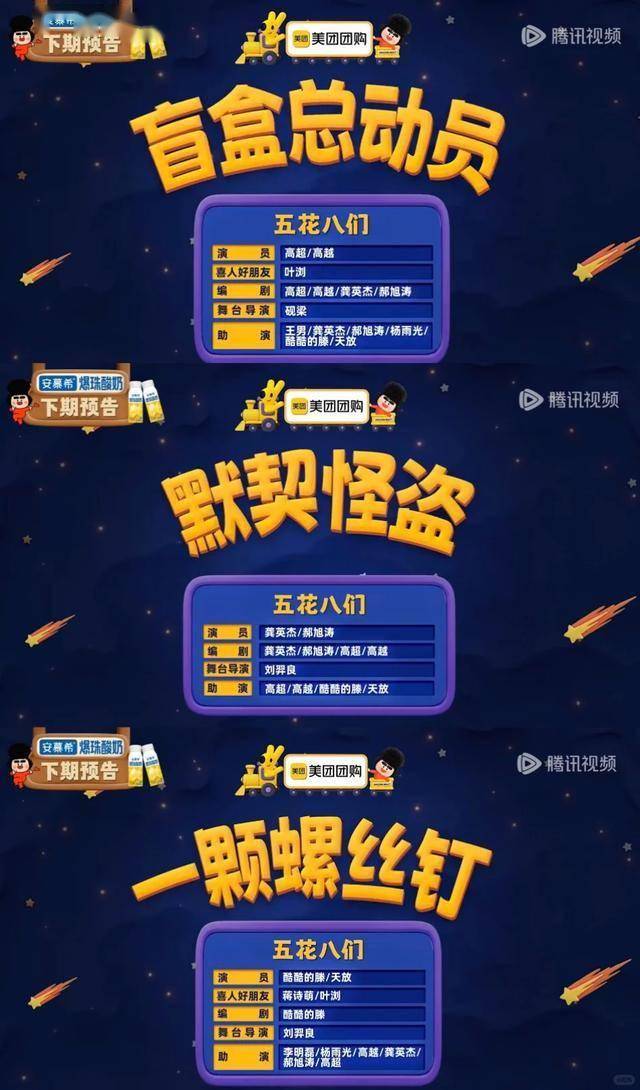 五花八们这个赛段的三个作品是《盲盒总动员》《默契怪盗》和《一颗螺丝钉》,其中只有两个作品有助演,不知道是老喜人的档期问题,还是别的原因。