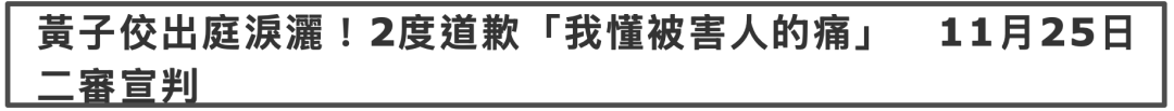 而此次二审,庭前、庭后黄子佼都90度向被害人鞠躬道歉。据台媒报导,庭讯时,黄子佼眼眶泛泪,强调自己不懂法律。庭后,黄子佼向一名被害人委任律师表示“我懂得被害人的痛”,但似乎不被律师接受。