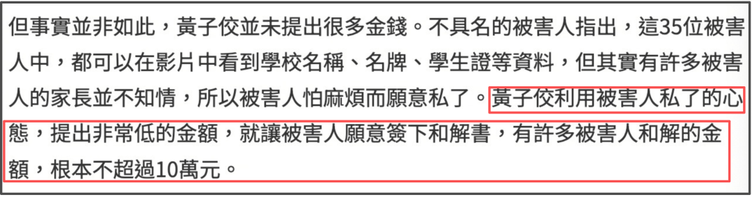 此前,外界传闻黄子佼利用“钞能力”与受害者达成和解,但根据被害人爆料,黄子佼并没有花很多钱。原因是这些被害人都可以在影片中看到学校名称、名牌、学生证等资料,但许多被害人的家长并不知情,因此被害人怕麻烦而愿意私了。