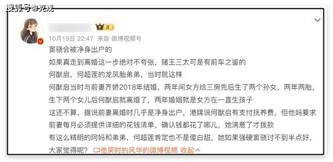 向太曝某富家女下嫁穷小子,两人如今正在闹婚变,直接将窦骁何超莲推上热搜。被推上风口浪尖的还有何超莲母亲——赌王三太何超莲。因为向太在视频中爆料,两人之所以闹离婚,是因为女方妈妈对不同意,抓住经济大权不给男方一分钱。