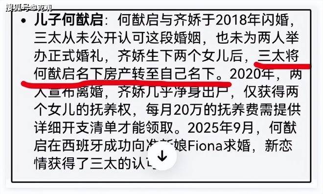 何超莲的双胞胎弟弟何猷启也有过一段婚姻,他和齐娇在2018年闪婚。可三太陈婉珍对齐娇并不满意,齐娇未婚先孕、国外注册等行为让三太对齐娇的印象不好,她并未为两人举办正式婚礼。齐娇生下2个女儿后,三太更是将何猷君名下房产转到自己名下。2020年,何猷君齐娇官宣离婚,女方几乎是净身出户。