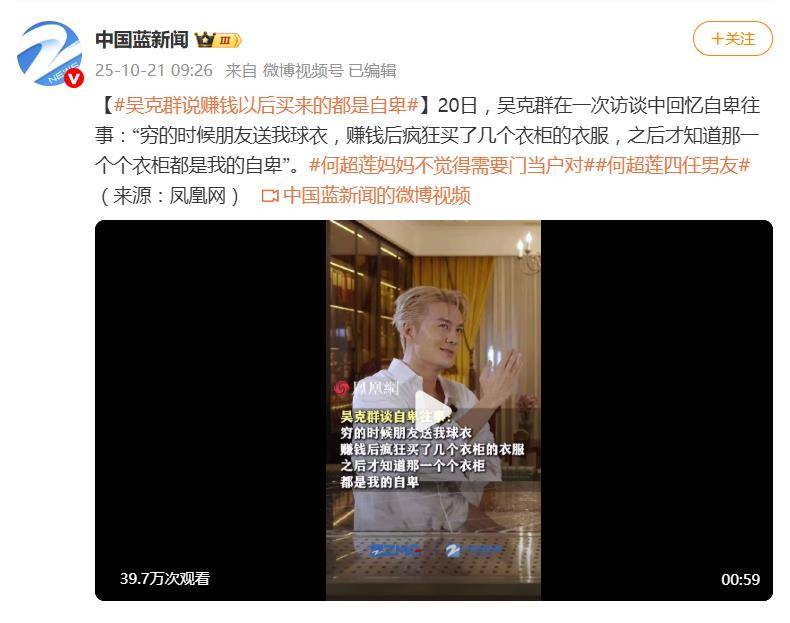 从报复性消费到主动“断舍离”,从物质武装到精神自由,吴克群的转变,恰是一场从“为他活”到“为我活”的成长历程。当多少人仍在用奢侈品包装自卑时,他的清醒在于:真正的自信,从来不需要用几个衣柜来证明。