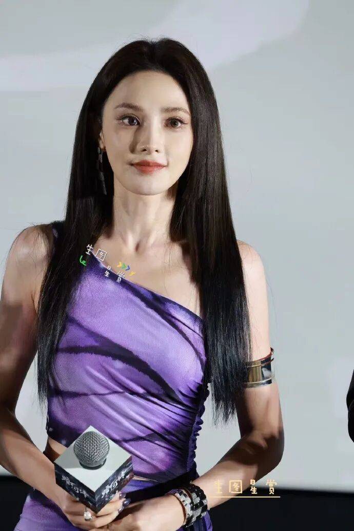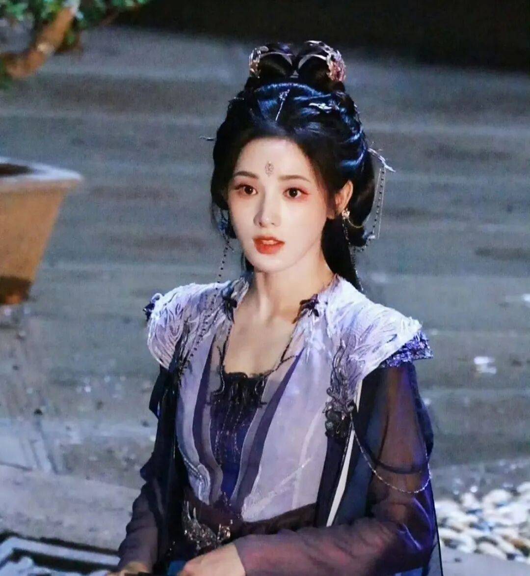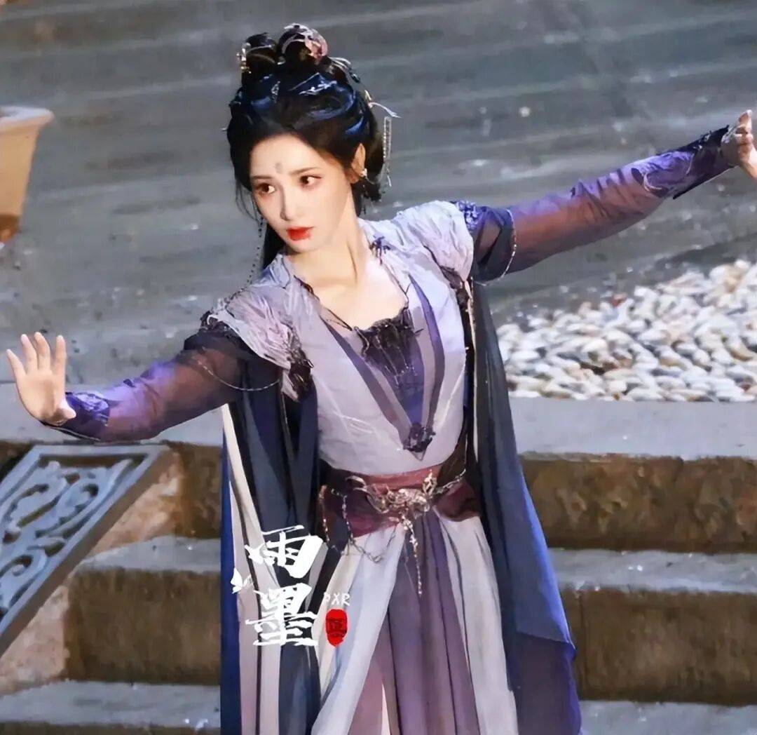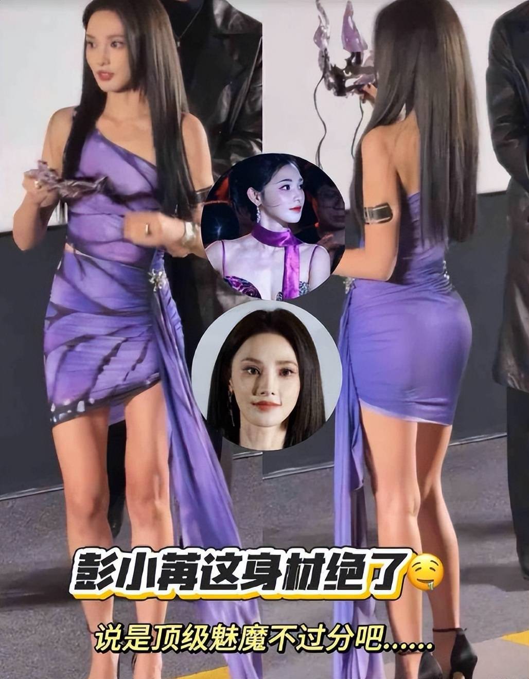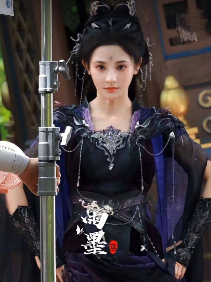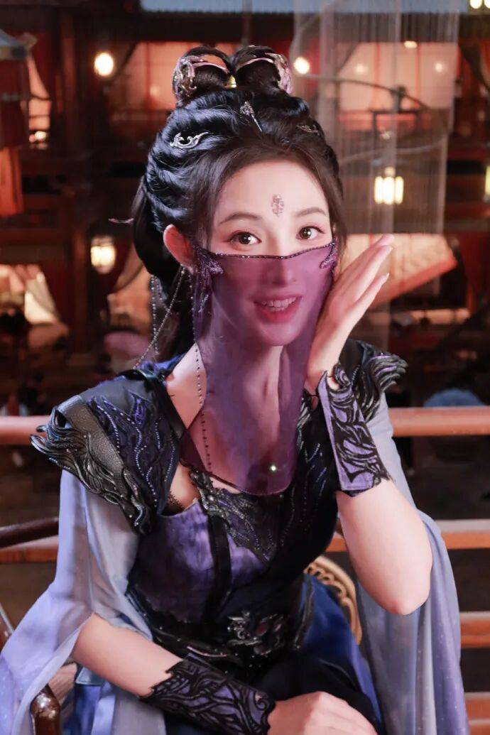 剧宣活动中,彭小苒身穿紫色包臀长裙+黑长直发型,延续慕雨墨的冷艳基调,她额间花钿与剧中面具呼应,被称“暗河蝴蝶女神”。