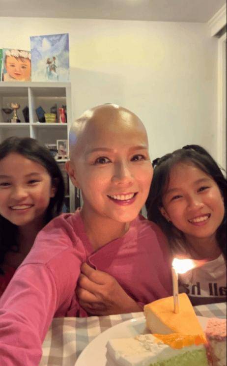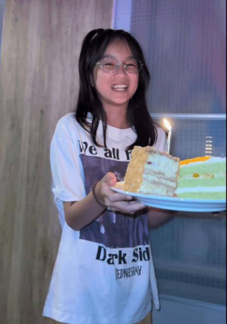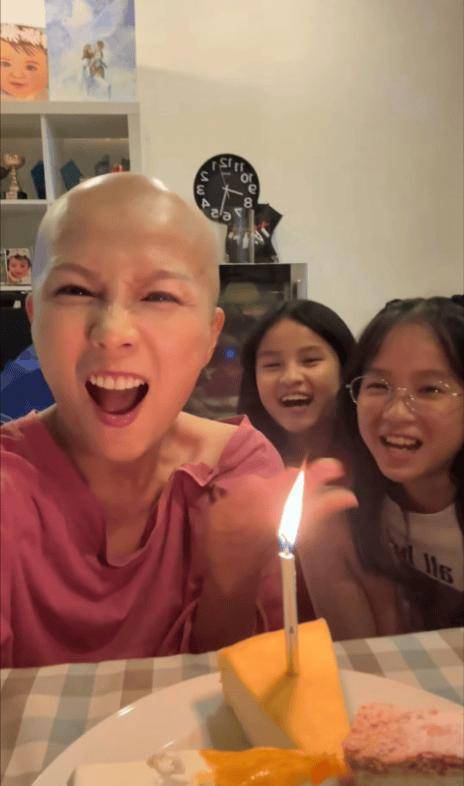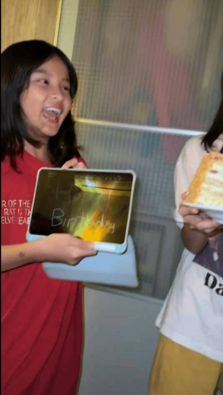 生日上,10 岁的大女儿陈芊彤(Scarlet)和 8 岁的小女儿陈施辰(Season),一个捧着蛋糕,另一个在平板电脑上写下 “Happy Birthday !Love U Mommy”,一起唱生日歌为妈妈庆生。大女儿还亲了妈妈一下,温馨又有爱。