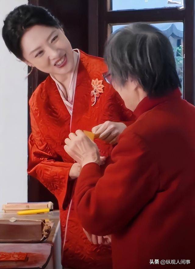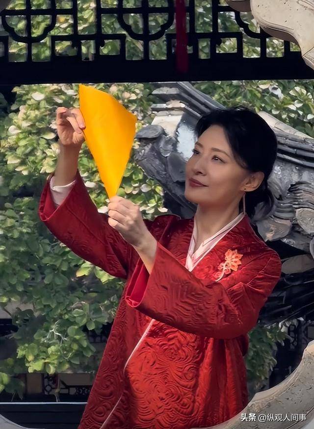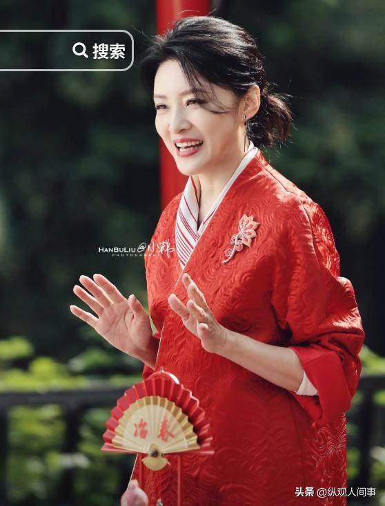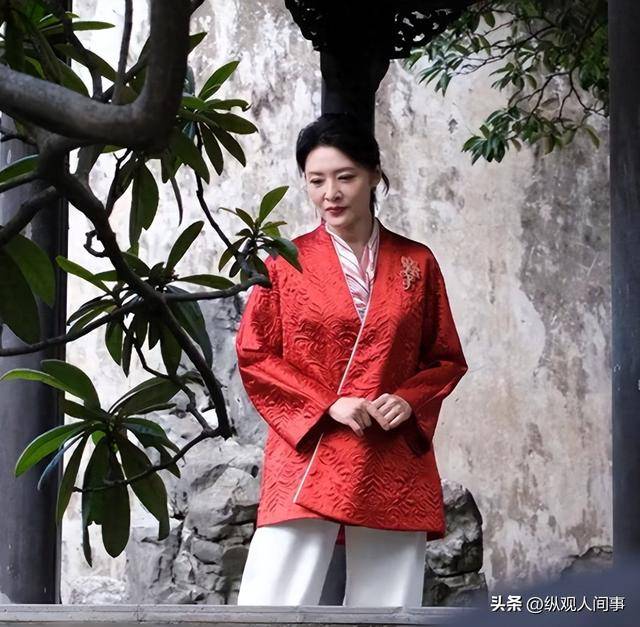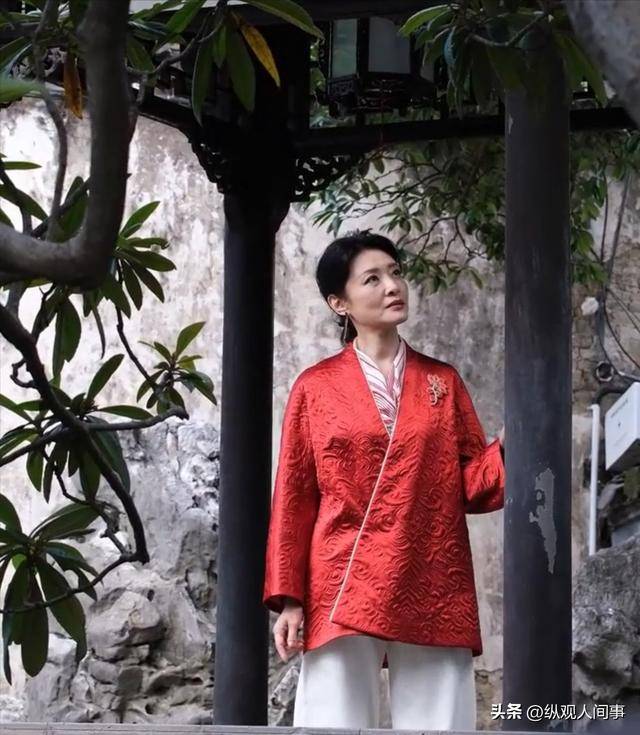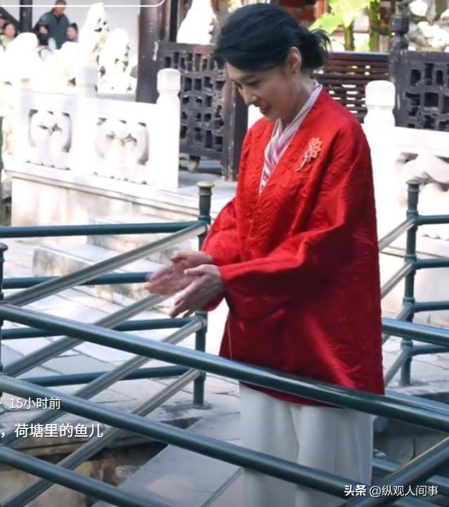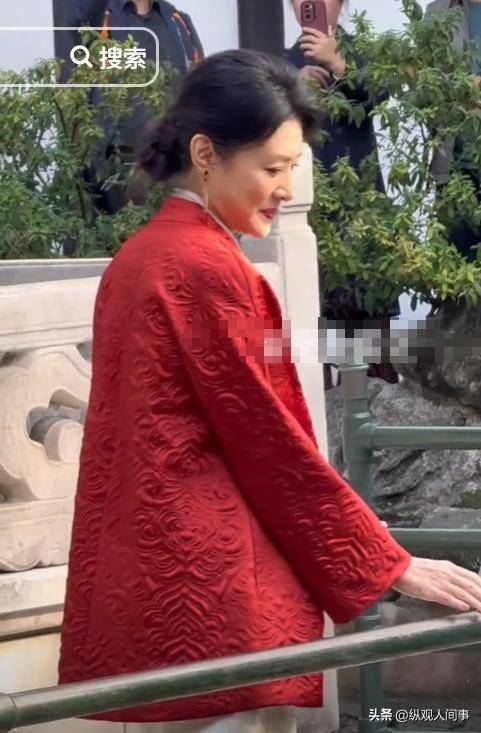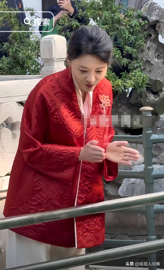 现场游客手机拍的生图里,她穿了一件大红色的中式上衣,搭配白色裤子,头发盘起,耳朵上戴着银色长链耳坠。