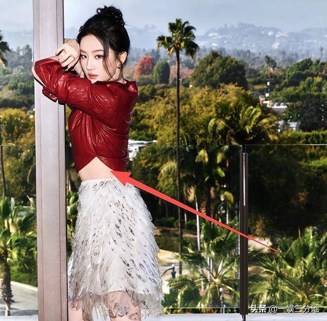 皮质的衣服做成了露脐装,对于微胖的刘亦菲来说很不友好,一抬手就露出了腰上的肥肉。