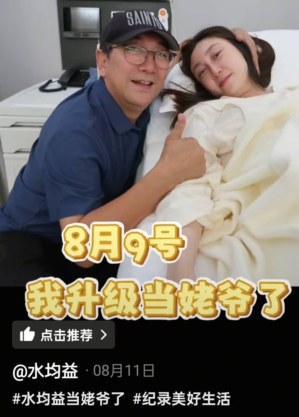 8月11日,水均益官宣当姥爷。31岁的女儿水亦诗和福建男篮队员相恋,生下可爱的女儿。水均益激动发文,和前妻罕见同框,并表示还不敢抱外孙女。