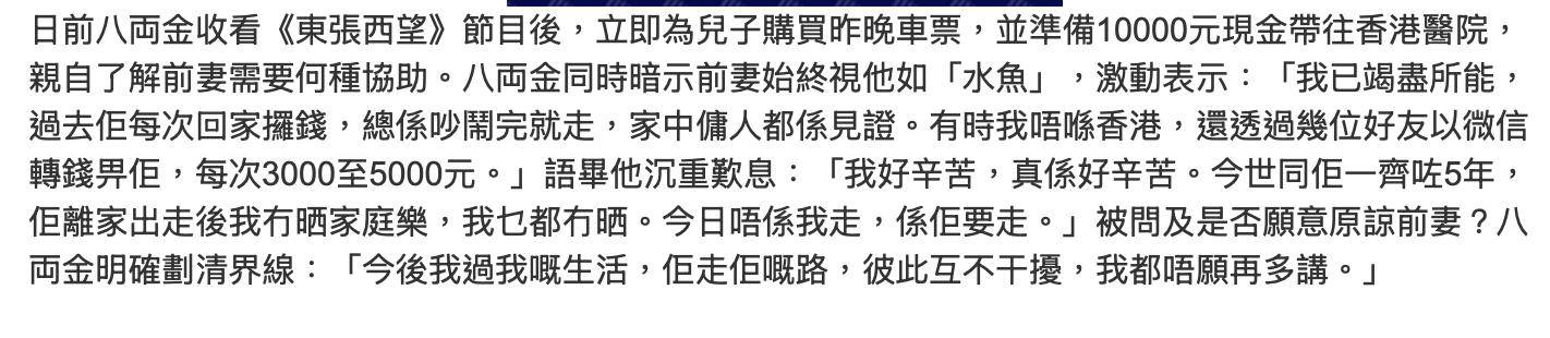 八两金称对前妻已经竭尽所能去满足对方,在看了新闻得知前妻出事后,他立即与儿子赶回香港,还准备了一万元的现金给前妻。不过八两金也表示自己已经心灰意冷了,对方每次回来要钱,一次要三五千的,要完就走,完全是把自己当成“水鱼”看待。八两还表示自己很辛苦,与对方在一起五年,生活都不快乐,当年前妻离家出走,自己就失去了家庭乐,如今已经无力再负荷,所以他郑重宣布,与前妻划清界限,今后彼此互不干扰,各走各路。