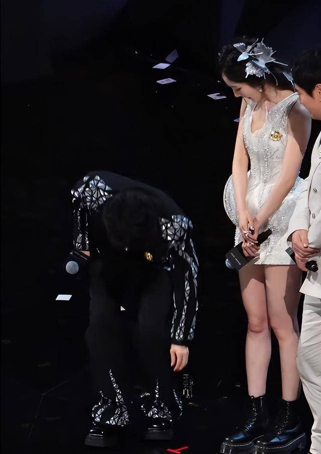 周深听到杨幂这么说,立马就准备蹲下来把彩带捡起来。