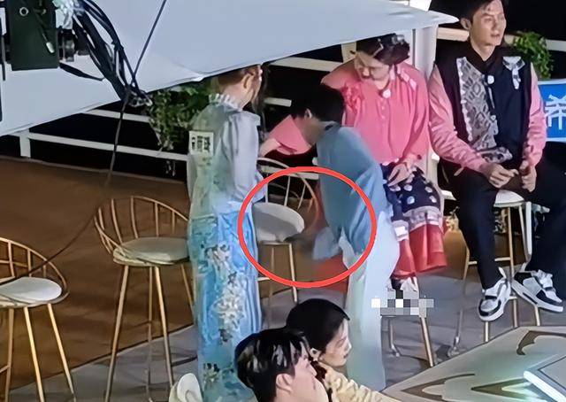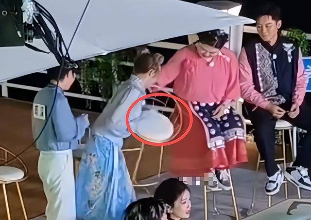有次录制节目,当天下了点雨,所以凳子上有点水。