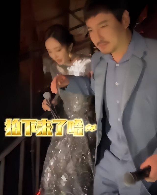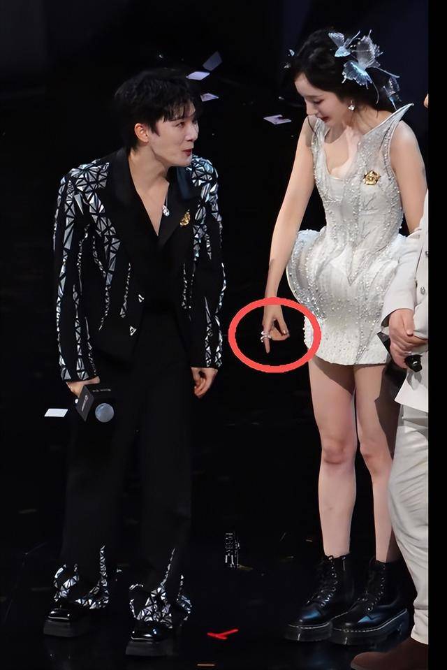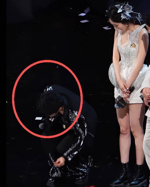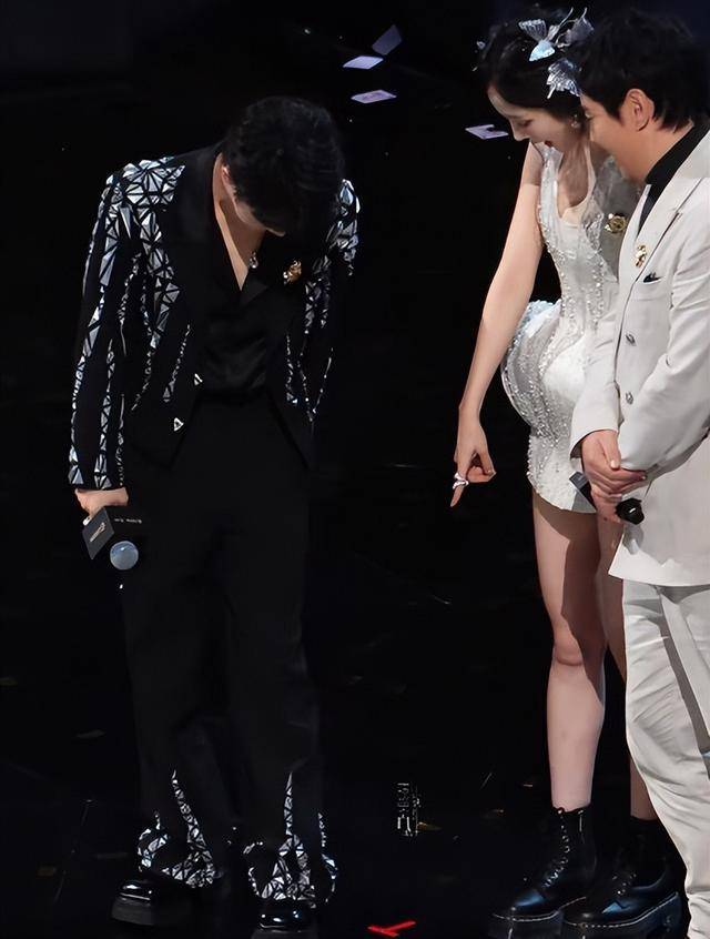 由于杨幂穿的是短裙,且舞台地面存在反光,虽然杨幂穿有安全裤,但周深若直接蹲身捡拾可能造成尴尬。