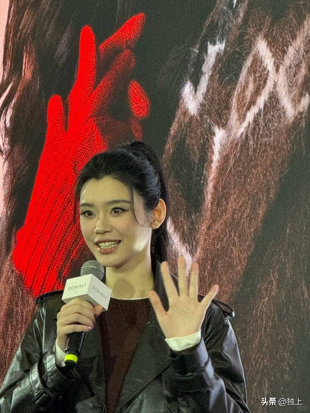 现场不少粉丝在线下围观,站在台上的奚梦瑶光彩夺目,舞台上只站了她一个人,可见品牌对她重视程度,奚梦瑶身穿品牌服饰,利落干净的版型,硬挺的皮衣,宽松的长款靴子,既展示了她的好身材,也展示了奚梦瑶对时尚的驾驭力,平平无奇的一套服装,穿在奚梦瑶身上非常洋气,又甜美又女人,浑身散发着美丽。