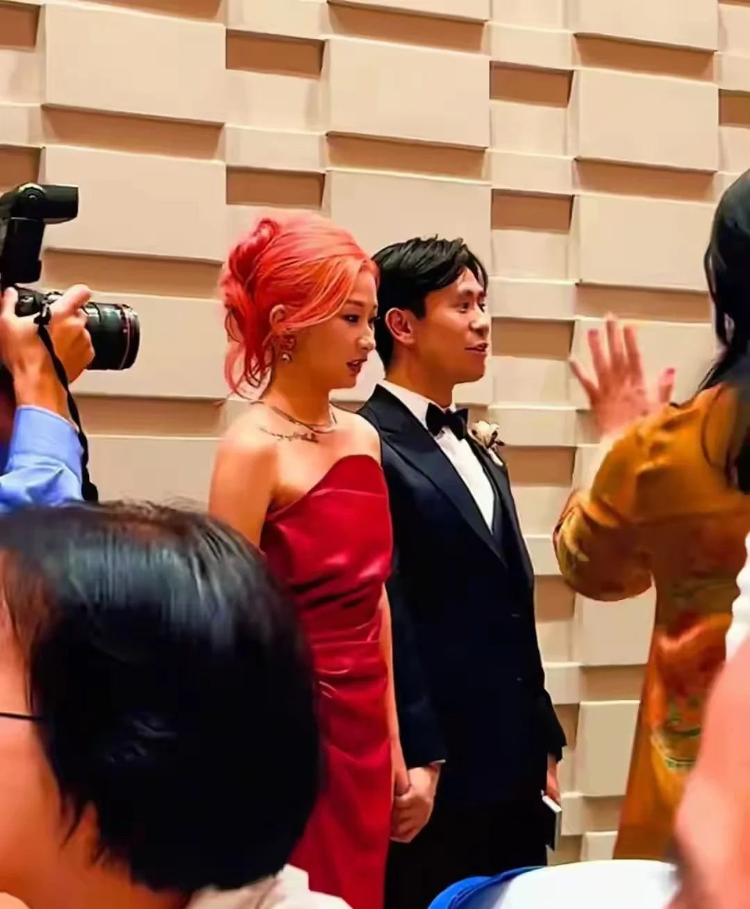 很快来到敬酒环节,原本顶着一头红色长发的刘一丝看起来有些俗气,结果换上敬酒服后,竟然十分好看,原来她的头发偏粉,还漂染着黄色,看似随意的挽着,实则层次分明,锁骨处的纹身也添色不少。