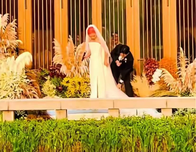 婚礼开始,刘一丝穿着洁白的婚纱入场,新郎还贴心地为她整理裙摆。