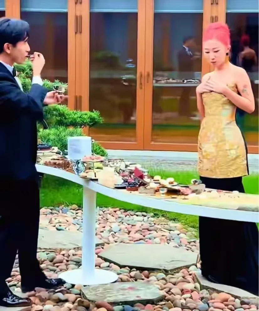 婚礼仪式结束后,进入到切蛋糕环节,刘一丝换了身抹胸礼服,上身金黄色、下身黑裙,脚踩厚底鞋、露着脚指头,也是别具一格了。