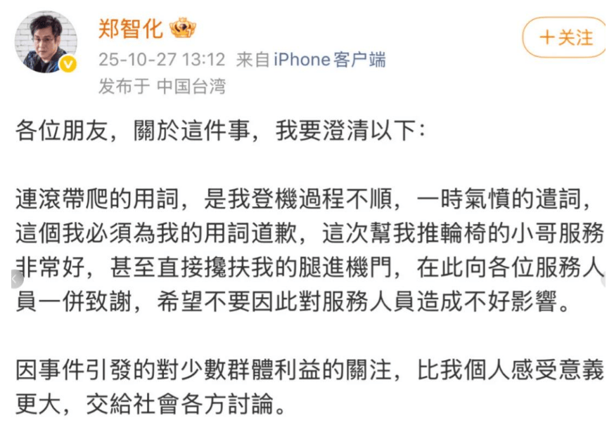 深圳机场事件,郑智化终于道歉了,但是这个道歉非常的没诚意,还把话题引导到其他地方,其心可诛