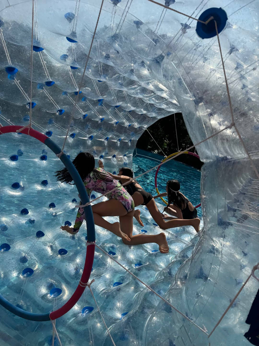 甚至为了让孩子们玩的开心,还特意安排了一个大大的充气球。几个孩子们穿着泳衣,在里面翻滚、玩闹,开心极了。