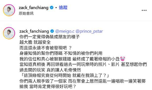 33岁台湾男星范姜彦丰昨日在社交网突然爆料,妻子粿粿婚内出轨,而偷食对象竟是香港女星邓丽欣的前男友“王子”邱胜翊!