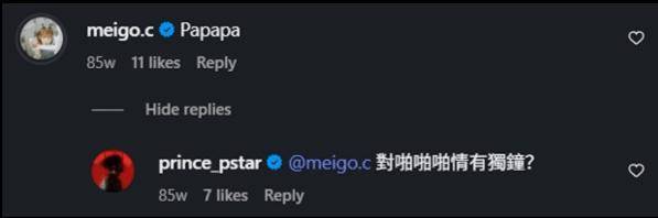 据悉,网友发现王子与粿粿经常在社交网搞暧昧,他曾在2024年3月上传了一段滑雪视频,背景音乐是ZAAC、Anitta和Tyga的《Desce Pro Play (PA PA PA)》,粿粿看到后就留言Papapa,结果他回应的是“对啪啪啪情有独钟?”。