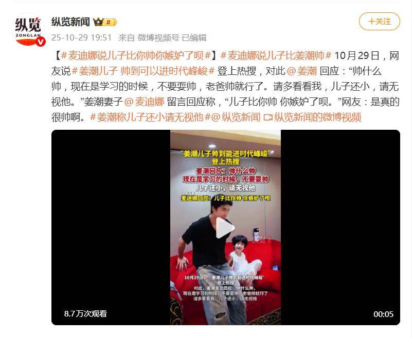 妻子麦迪娜在评论区神补刀:“儿子比你帅,你嫉妒了呗。”这番互动让网友瞬间炸锅,纷纷解读姜潮是“醋坛子老爸上身”,更赞其回应是“育儿范本”。