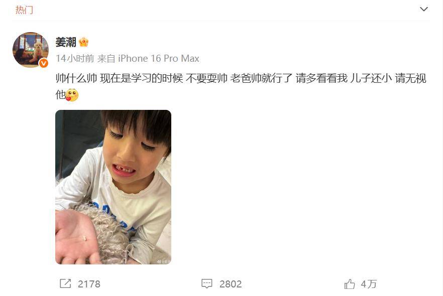 10月29日,演员姜潮一条“自恋式”微博,瞬间点燃了全网围观热情。面对网友热议他6岁儿子姜丹尼尔“帅到可以原地签约时代峰峻”的调侃,这位老爸直接甩出金句:“帅什么帅,现在是学习的时候,不要耍帅,老爸帅就行了。请多看看我,儿子还小,请无视他!”