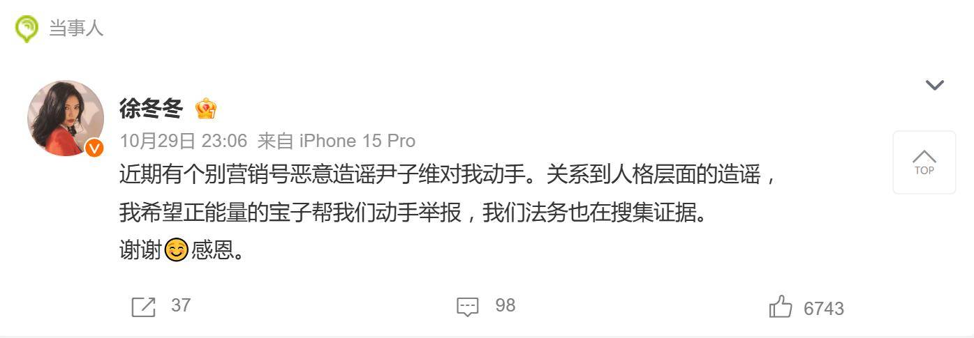 据10月29日报道,演员徐冬冬在微博上正面回应“尹子维动手”的传闻,直接引爆热搜。她明确表示“近期有个别营销号恶意造谣尹子维对我动手”,并强调这类谣言已触及人格底线,不仅要求粉丝帮忙举报,还放话团队法务已着手取证,要追究造谣者的法律责任。