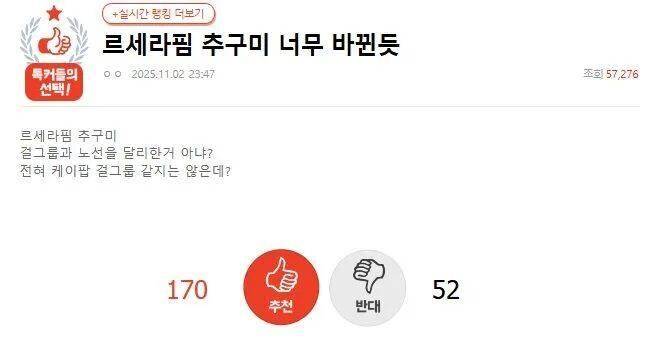 事情源于一则热帖。有网友晒出成员允珍和采源的近照,直言组合“气质巨变”,质疑她们“和其他女团走的根本不是一条路”。该帖迅速引爆5.7万浏览量,底下评论更是刀光剑影。有人讽刺“LE SSERAFIM根本不具备走红的颜值”,有人惊呼“天啊,我当时被吓到了”,甚至有人毒舌吐槽:“那是金淑吗?”(注:金淑为韩国知名搞笑女艺人)