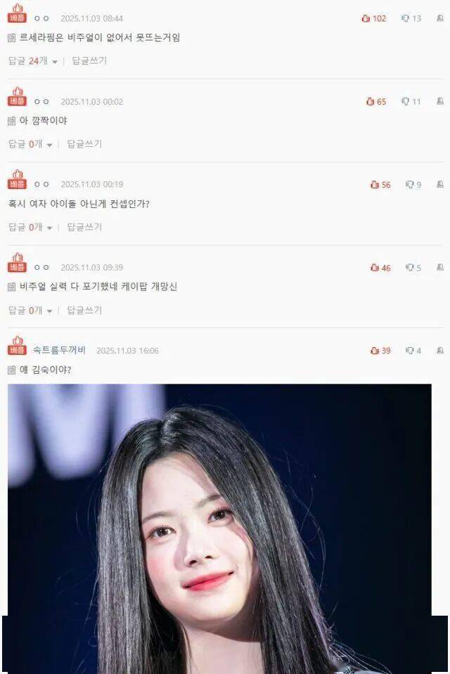 尽管少数声音认为这是“艺术成长的体现”,但绝大多数网友的炮火堪称碾压级。不少人痛心疾首:“颜值与实力双双放弃…真是K-Pop之耻”;还有人犀利反问:“她们的设定就是‘非女团’吗?”——言下之意,这支组合似乎正在偏离大众对K-Pop女团的传统期待。