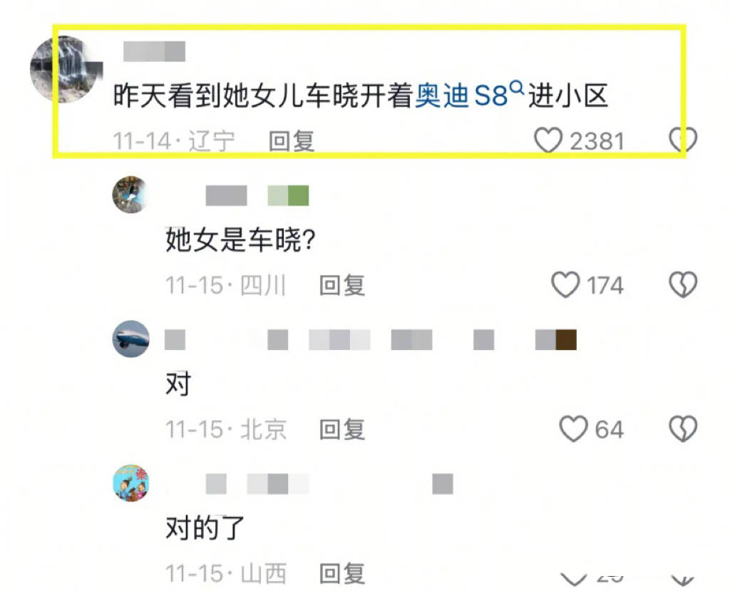 车晓开的是奥迪S8,妈妈王丽云开的是20年前的尼桑。当然这样的对比,也不能说明是车晓对妈妈不好。