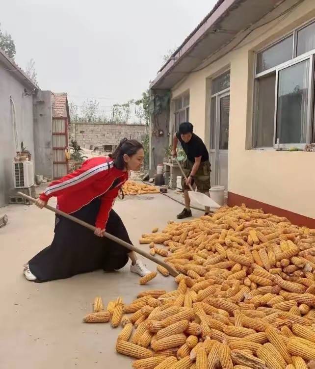 程莉莎回农村,真的是一点都不矫情。这次是到田里挖白菜,上次是在院子里收玉米。程莉莎穿着黑色收腰长裙,手里拿着铁锨,和老公郭晓东一起忙着收玉米。