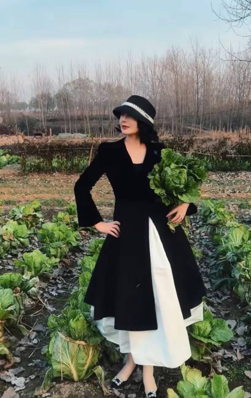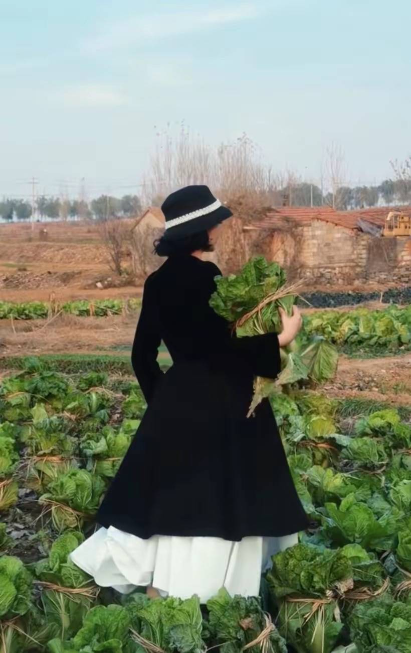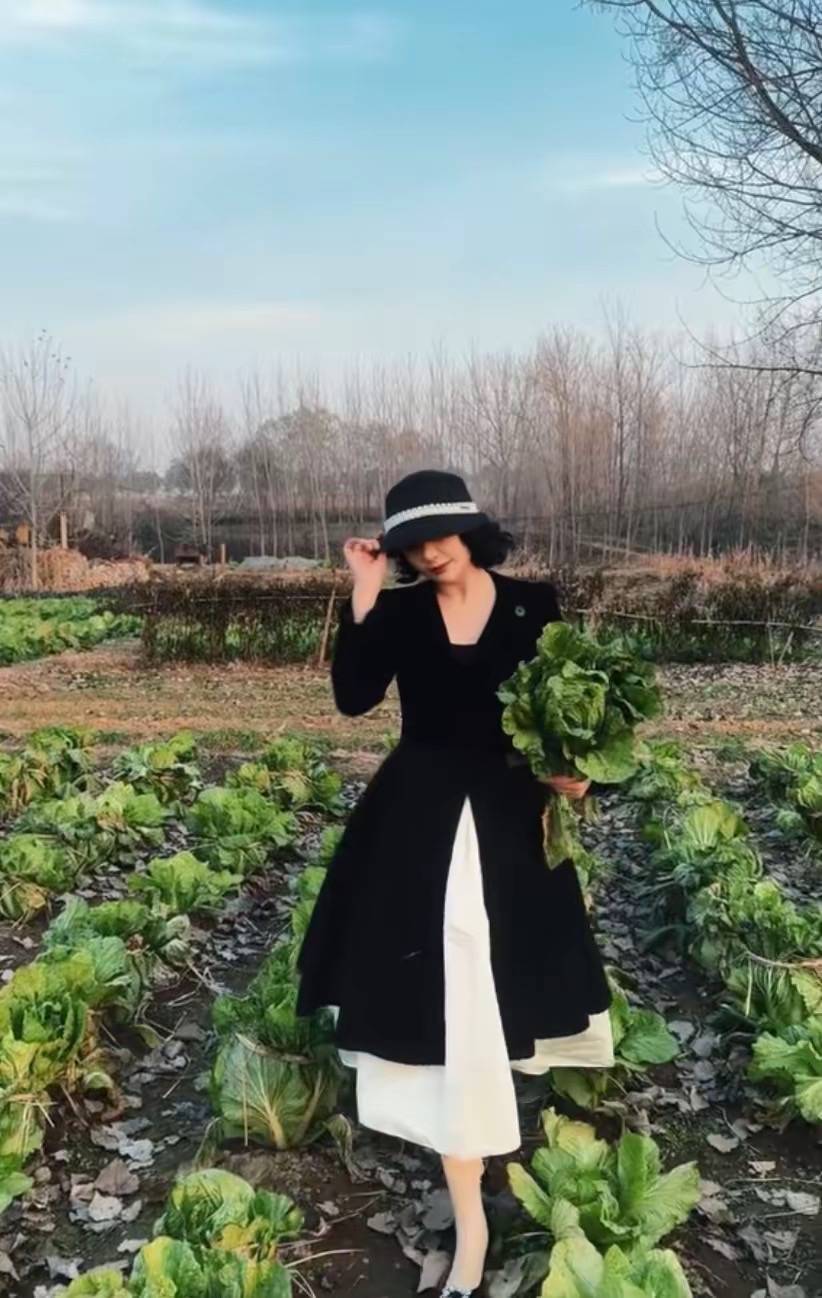 程莉莎蹲在地上,挖起一棵大白菜,接着就把白菜当道具来拍大片了。她在田间地头掐着腰,侧着脸,关键是胳膊里还夹着一颗大白菜,仿佛拿在手里的不是大白菜,是挎在手里的爱马仕。