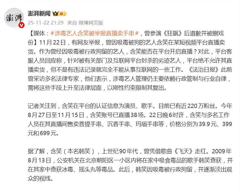 曾因吸毒丑闻淡出公众视野的歌手含笑,如今以“韩朴俊”之名、顶着220万粉丝的网络主播身份杀回直播间卖手串,这波操作瞬间点燃了舆论的炸药桶。一边是缉毒警察的鲜血与牺牲,一边是涉毒艺人转型主播的“再就业”,这场关于道德底线与工作权利的激烈对峙,狠狠撕开了涉毒艺人监管的灰色地带。