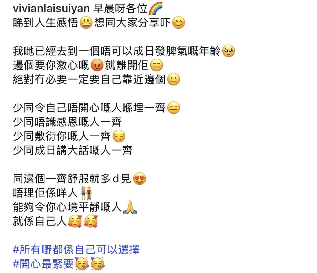 黎瑞恩晒照之余,又不忘感慨一番,她称已经到了一个不可以总是发脾气的年龄阶段,要远离那些不会让自己开心,不懂感恩,总是说大话,总是敷衍的人,多与那些能让自己舒服,让自己心境平静的人在一起,这些才是自己人。不知道她所指的是什么,但是晒出与儿子的旅游合照,那么相信儿子也绝对是她所说的可以让自己舒服的人。黎瑞恩这些年总是不时地有感而发,人生的经历多了,感受也多了,于是就以过来人的身份自勉自励。