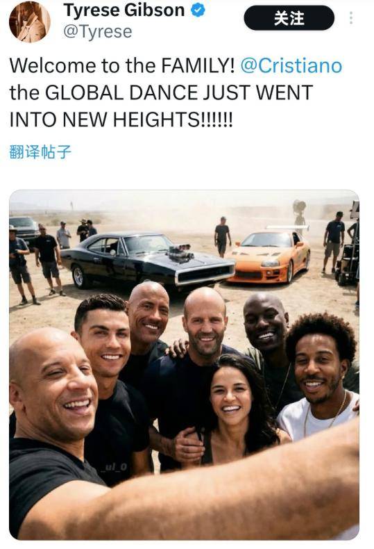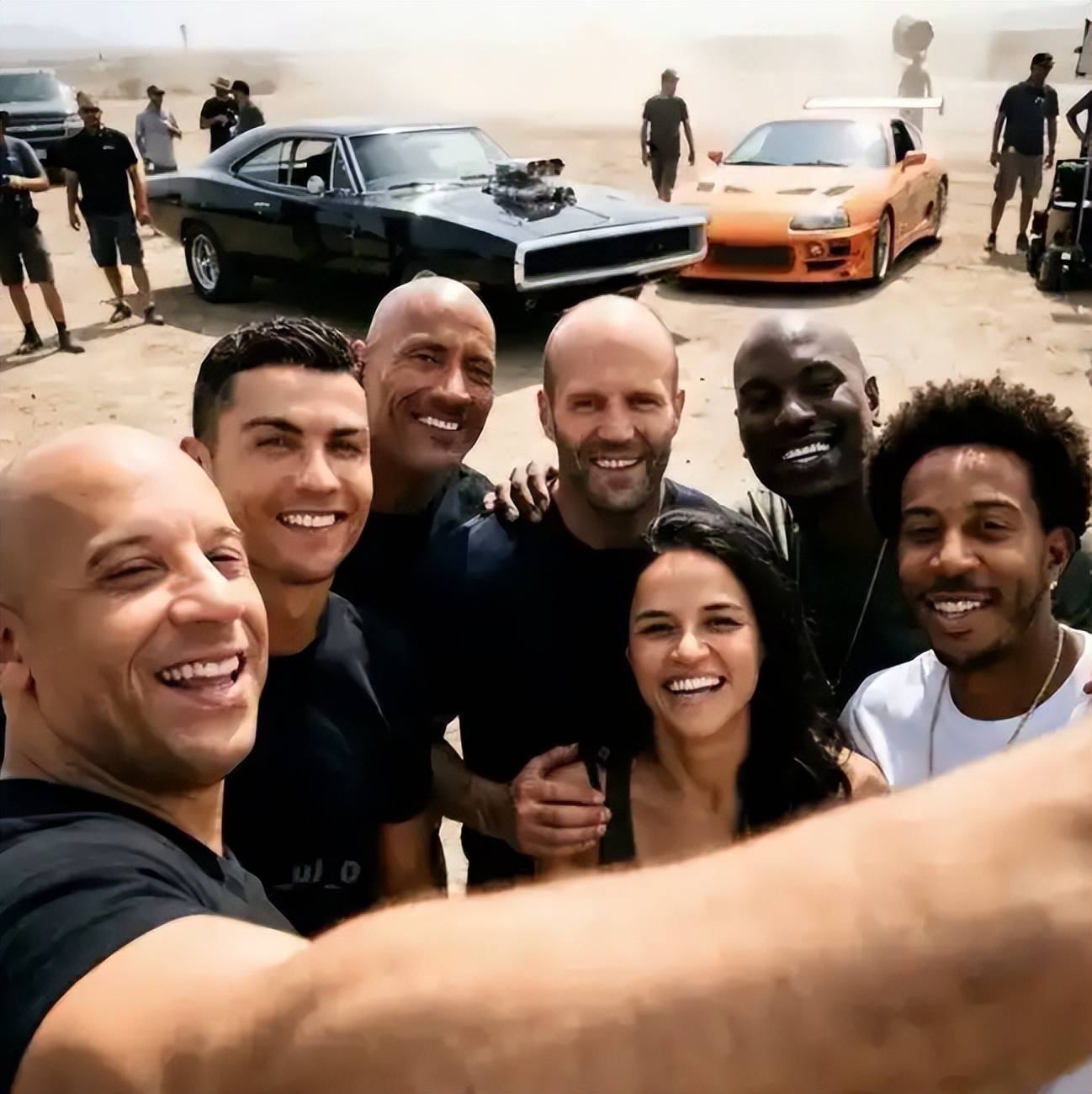 热度还未褪去的第五天,系列主演泰瑞斯・吉布森发布 AI 生成的主演团同框合影,C 罗身影赫然在列,为这场跨界合作送上了第二波官方实锤。